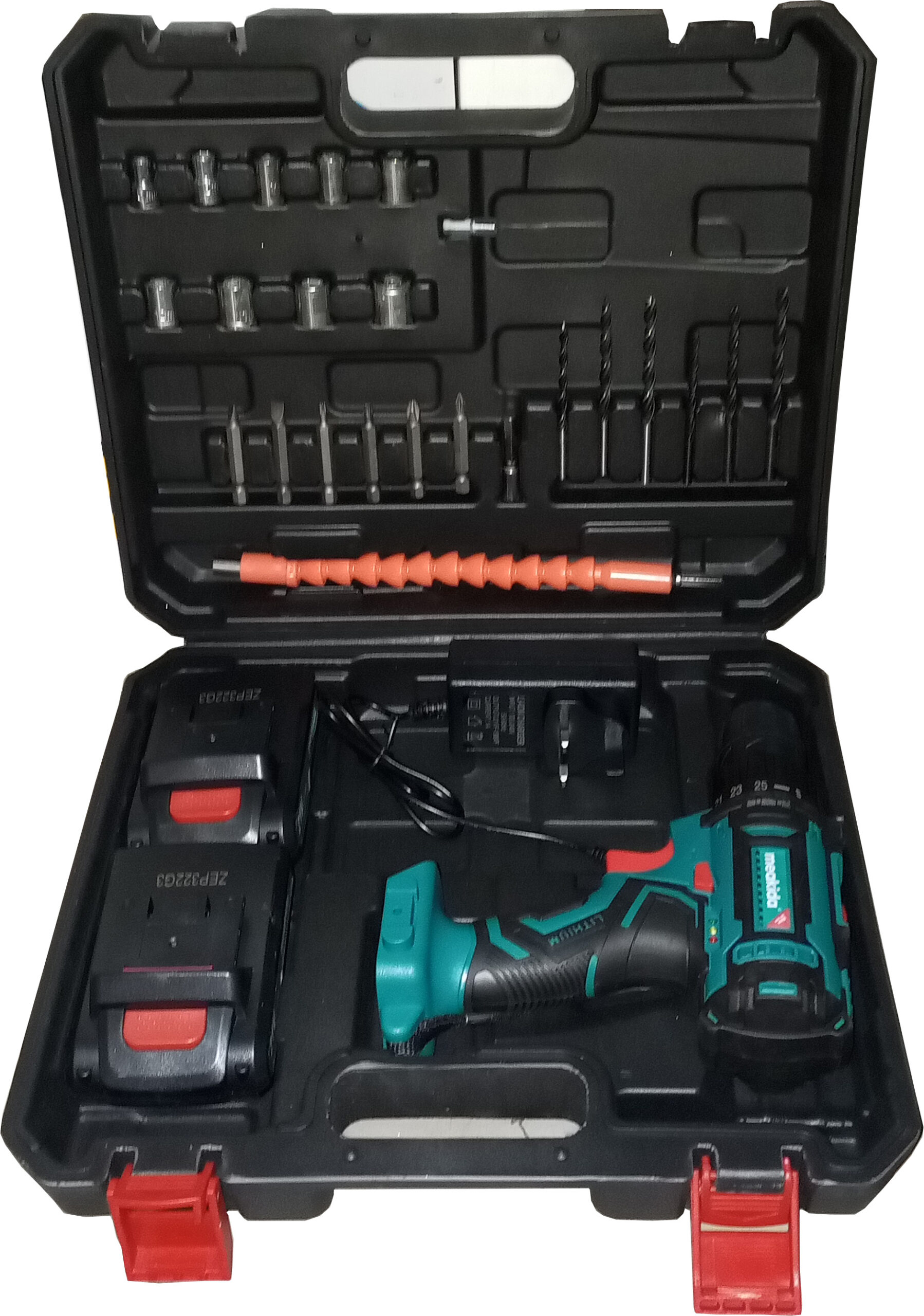 – Includes: Screwdrivers, Drill bits, magnetic mini bits, essential box spanner sockets, cordless drill, 2x batteries, 1x charger